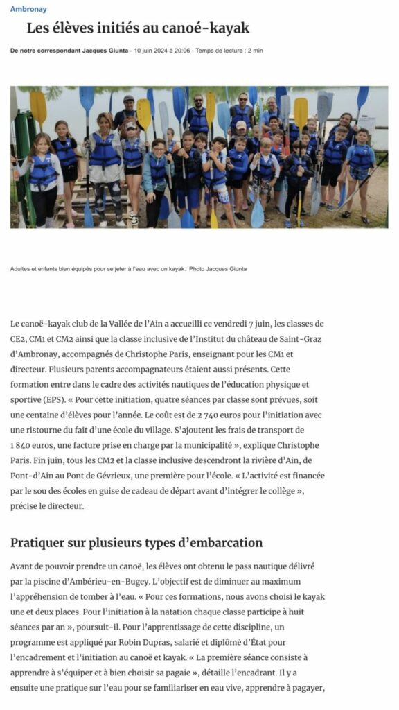 Le Canoë-Kayak Club de la Vallée de l’Ain a accueilli les classes de CE2, CM1 et CM2, ainsi que les élèves de la classe inclusive de l’Institut du château de Saint-Graz. Sous la supervision de Christophe Paris, directeur de l’école et enseignant, cette immersion s’inscrit dans le programme d’Éducation Physique et Sportive (EPS) pour favoriser l’autonomie et la cohésion de groupe.